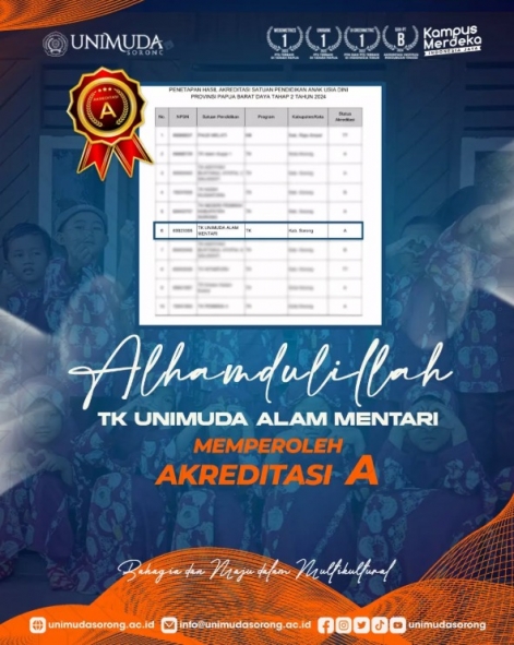 Alhamdulillah, TK UNIMUDA Alam Mentari memperoleh Akreditasi A, Berdasarkan Keputusan Badan Akreditasi Nasional PAUD, Pendidikan Dasar & Pendidikan Menengah Nomor : 171/BAN-PDM/SK/2024.